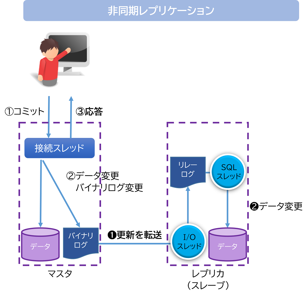 非同期レプリケーションは、データとバイナリログが更新されると、MySQLサーバがクライアントにコミット完了の応答をします。
