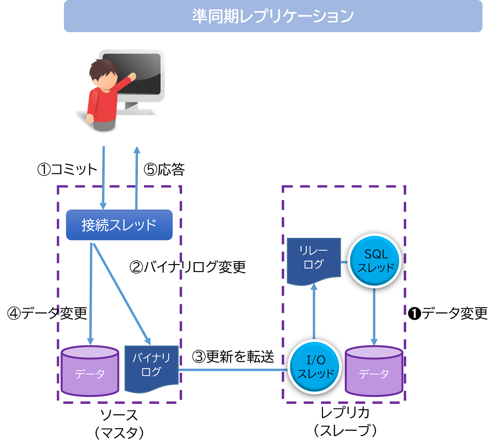 非同期レプリケーションは、応答性能は準同期レプリケーションより高速に処理できますが、ソース(マスタ)の更新内容を転送するのがトランザクション外であるため、ソース(マスタ)障害のタイミングによってはデータをロストする可能性があります。