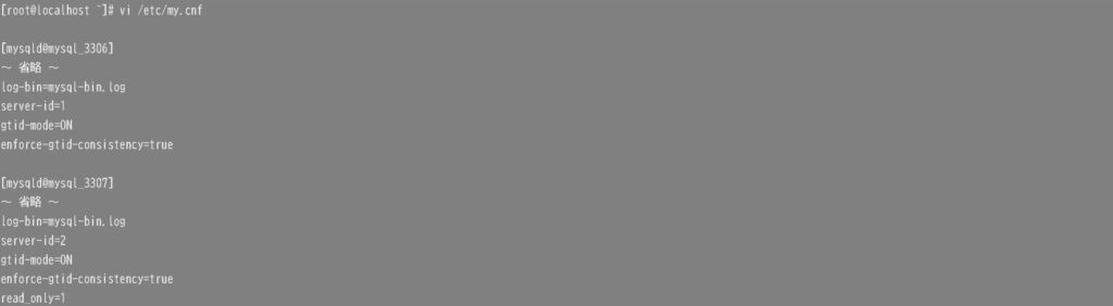 今回は同一サーバ上に2インスタンス構築しているので、同じmy.cnfにそれぞれのレプリケーションパラメータを追記します。