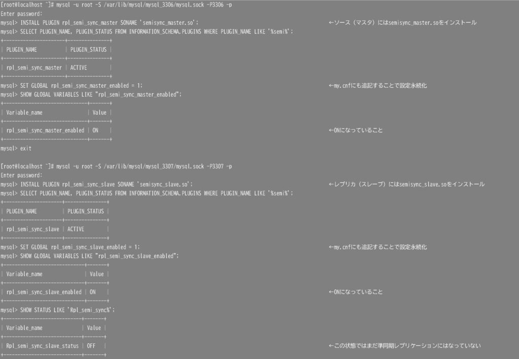 準同期レプリケーションのプラグインをソース(マスタ)とレプリカ(スレーブ)にそれぞれインストールし、有効化にします。