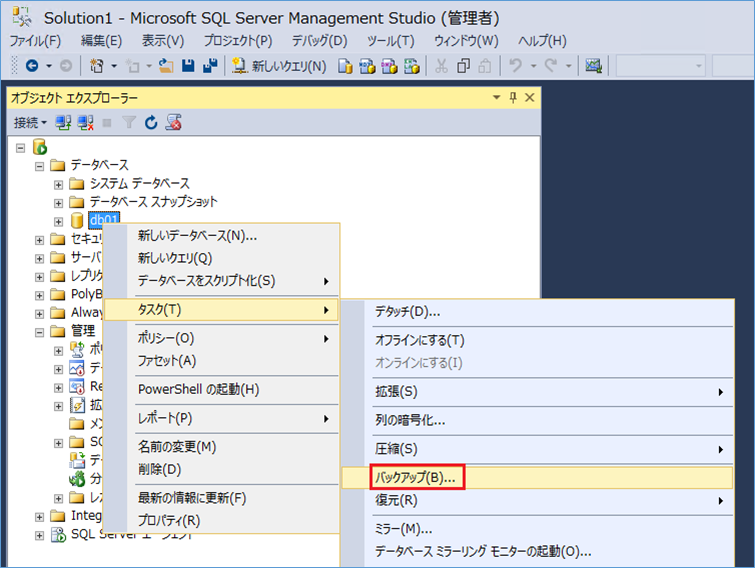 ②ユーザーデータベースのバックアップは「データベース」→「タスク」→「バックアップ」を選択します。
