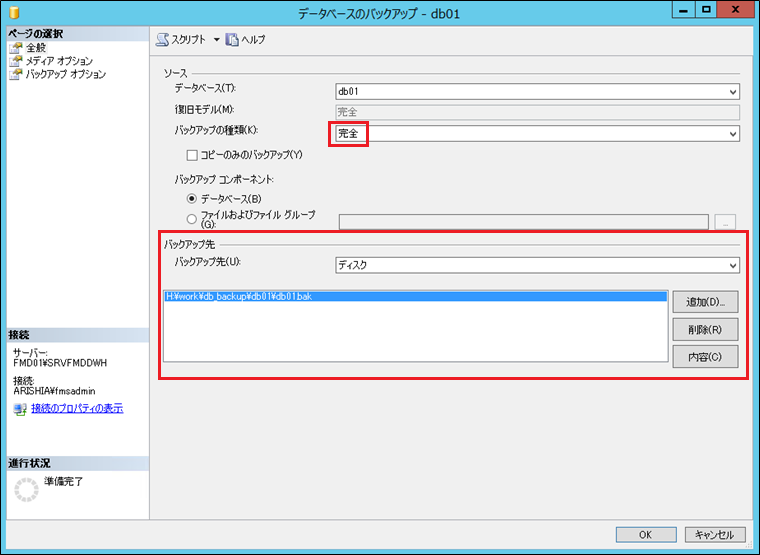 ③「バックアップの種類」で「完全」を選択し、バックアップの出力場所は「バックアップ先」にて指定します。