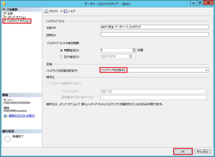 ④必要に応じて「バックアップオプション」で「バックアップを圧縮する」を選択します。