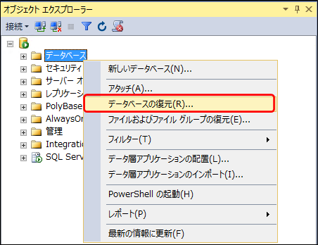 ②ユーザーデータベースのリストアは「データベース」→「データベースの復元」を選択します。
