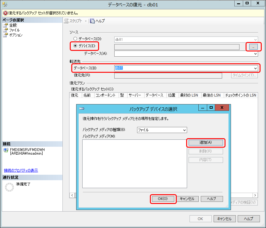 ③バックアップファイルは「デバイス」→「…」→「バックアップデバイスの選択」で移行用ディスク等を指定します。
