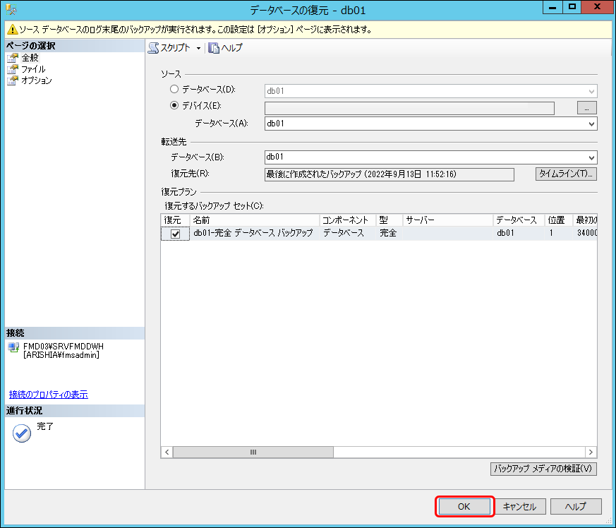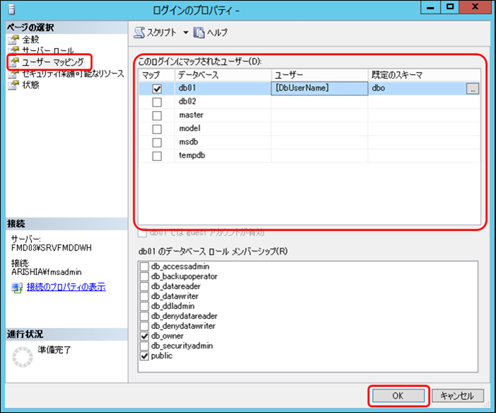 ・「ユーザーマッピング」→「このログインにマップされたユーザー」にて確認し、移行元と移行先が異なっている場合は同様に設定し、「OK」を押下。