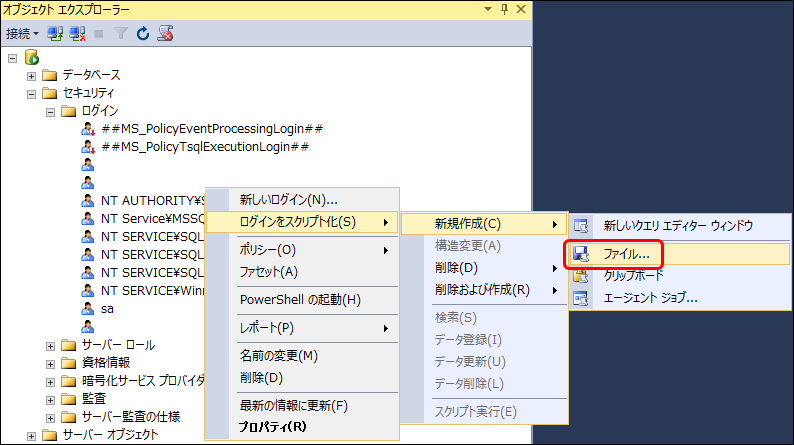 ②ログインのバックアップは、「セキュリティ」→「ログイン」→右クリック「ログインをスクリプト化」→「新規作成」→「ファイル…」を選択し、移行用ディスク等に出力します。