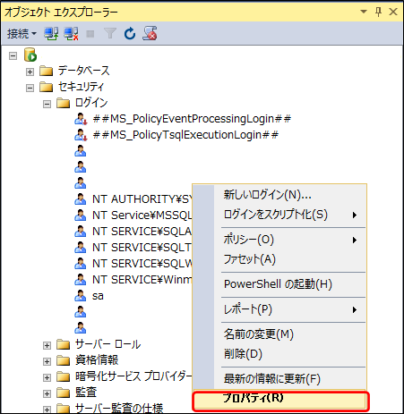 ①SQL Server Management Studioを右クリックして「管理者ユーザーとして実行」で起動し、ログインの管理者ユーザーで接続します。