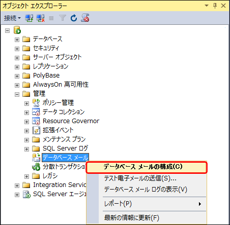 ②「管理」→「データベースメール」→「データベースメールの構成」を実行します。