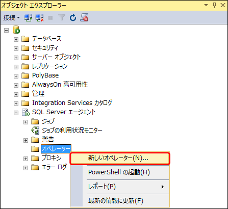 ②「SQL Serverエージェント」→「オペレーター」→「新しいオペレーター」を実行します。