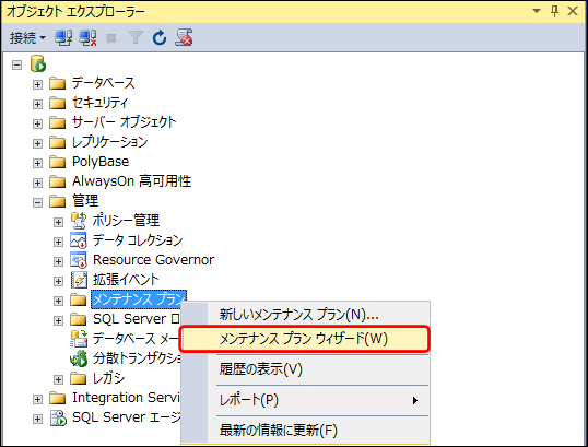 ②「管理」→「メンテナンスプラン」→「メンテナンスプランウィザード」を実行します。