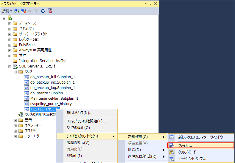 ②SQL Serverエージェントジョブのバックアップは「SQL Serverエージェント」→「ジョブ」→右クリック「ジョブをスクリプト化」→「新規作成」→「ファイル…」を選択し、移行用ディスク等に出力します。
