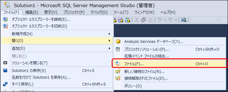 ②バックアップしたSQL Serverエージェントジョブのスクリプトを「ファイル」→「開く」→「ファイル」で開きます。