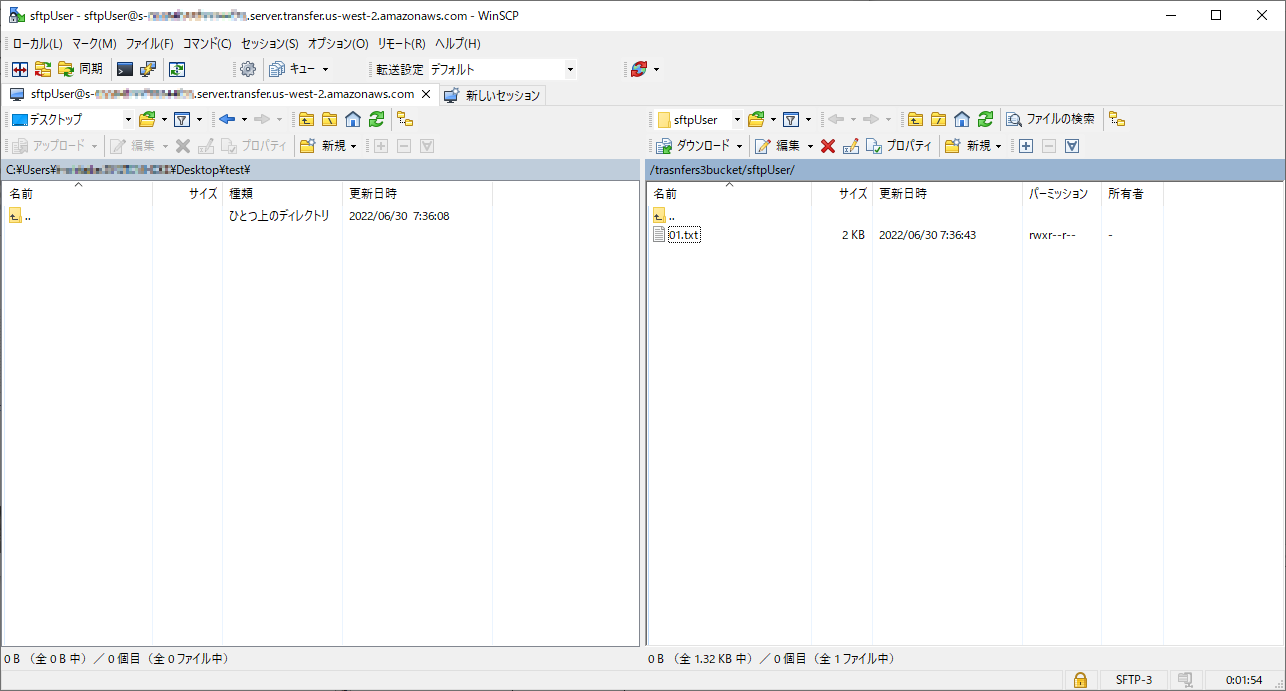 WinSCPを使用して、先ほど作成したSFTPのエンドポイントへ接続し、秘密鍵を使用して認証を行う。