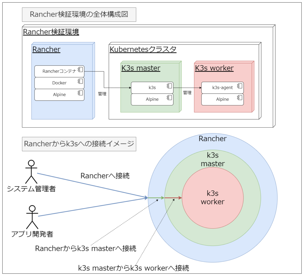 本記事は、以下の図のようにRancherとRancherが管理するKubernetesクラスタを構築することがゴールとなります。