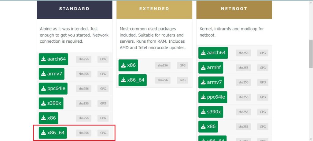 まずは公式サイトから Alpine OS の ISOファイルをダウンロードします。