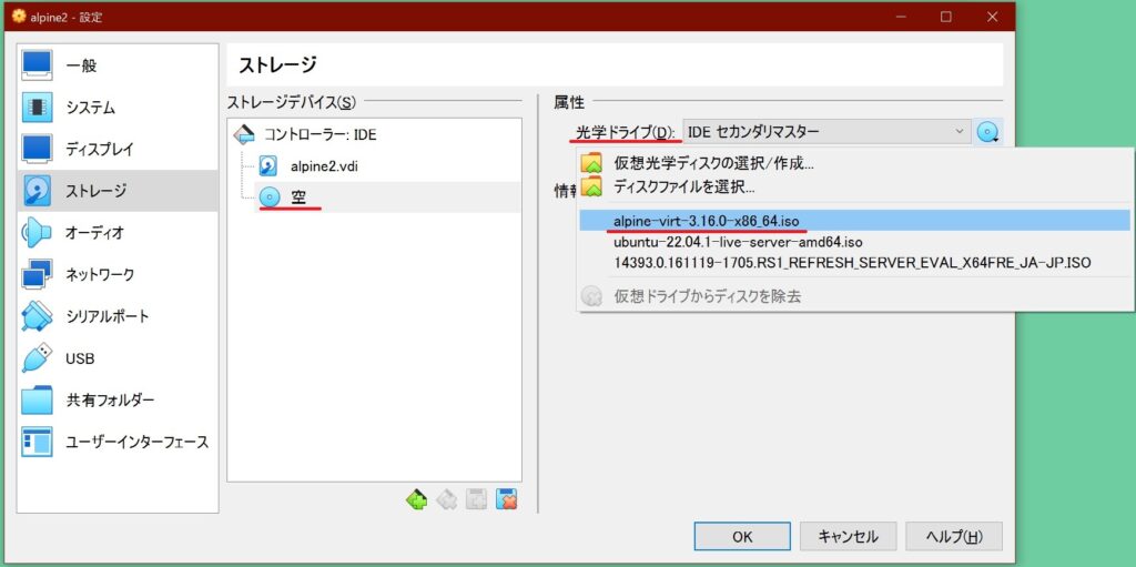セットアップが完了した後、ISOファイルのマウントを外し、仮想マシンを再起動することでAlpineの構築は完了です。