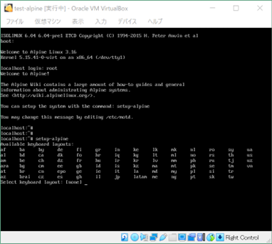 上記サイトから入手したISOファイルを使用し、社内の仮想マシン上でAlpineのセットアップを行います。