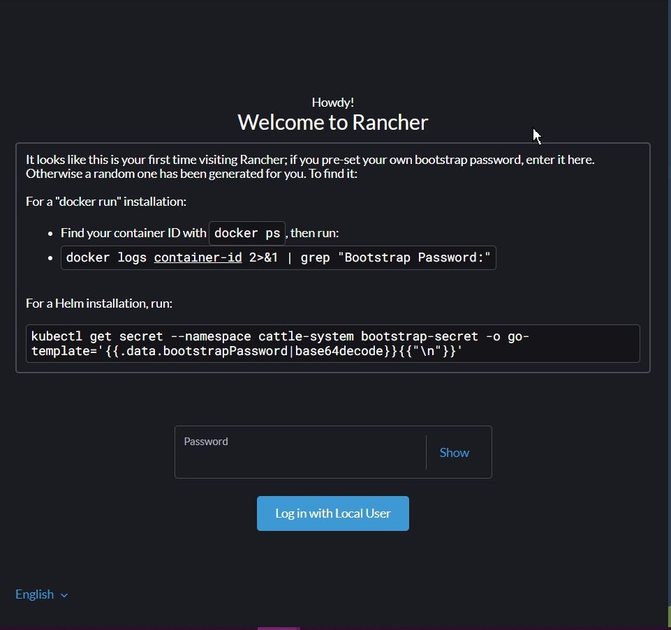 Rancherが問題なくデプロイできたら、以下コマンドでRancher初回ログイン時のパスワードを確認し、控えておきます。