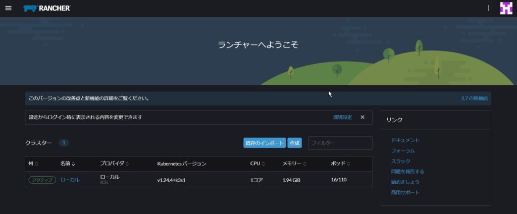 Rancherのホーム画面が表示されることを確認できたら、Rancherの構築は完了です。