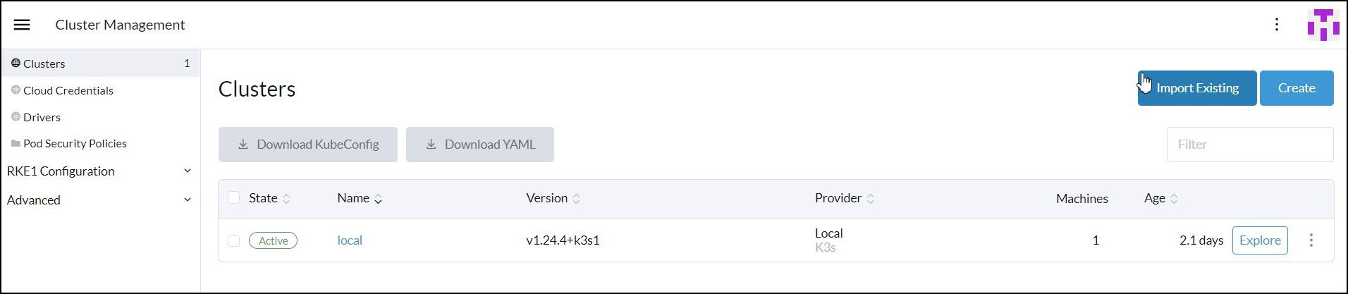 ログインしたら画面左から「Cluster Management」を選択し、「Cluster」の画面から「Import Existing」を選択します。
