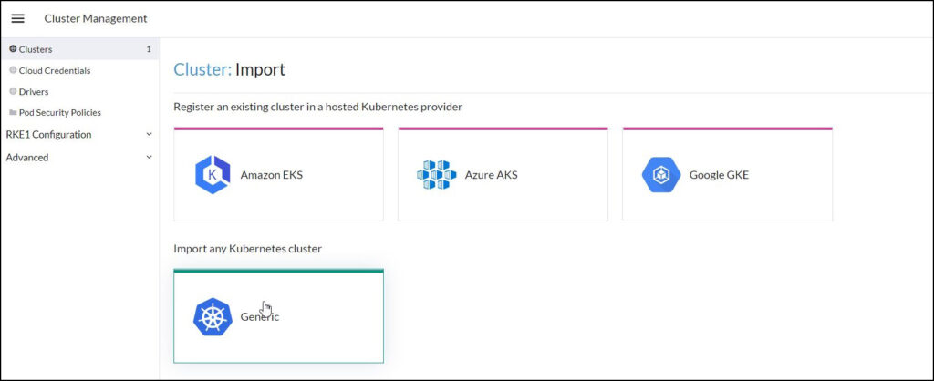 「Amazon EKS」「Azure AKS」「Google GKE」などのクラウドサービスがありますが、今回はVM上に構築したK3sなので「Generic」を選択します。