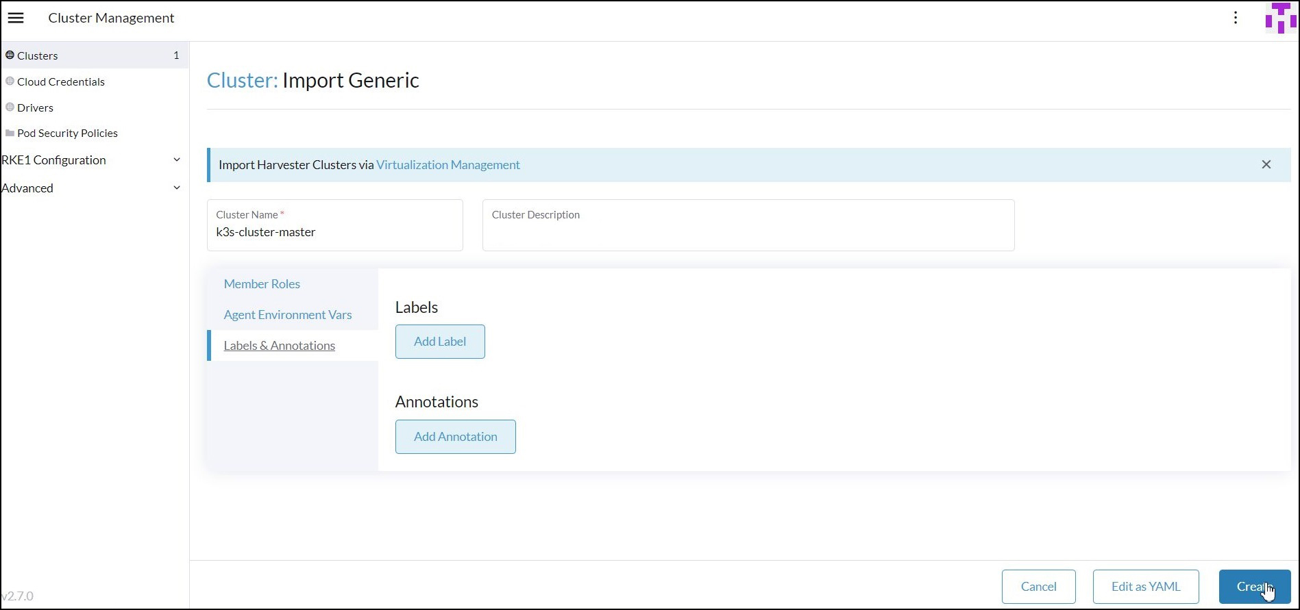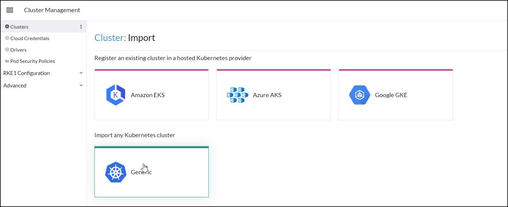 次に、構築したKubernetesをRancherに登録し、管理できるようにしましょう。