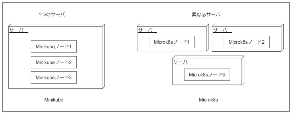 minikubeの場合は同じ環境上に仮想マシンやコンテナを複数起動することで実現しています。