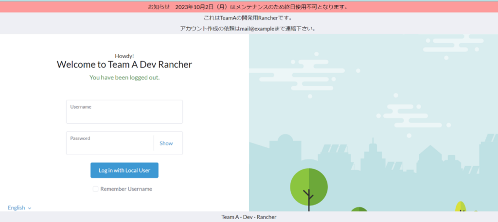 またログイン画面のバナーには、問い合わせ先やどこのチームのシステムなのかが分かるようにしています。