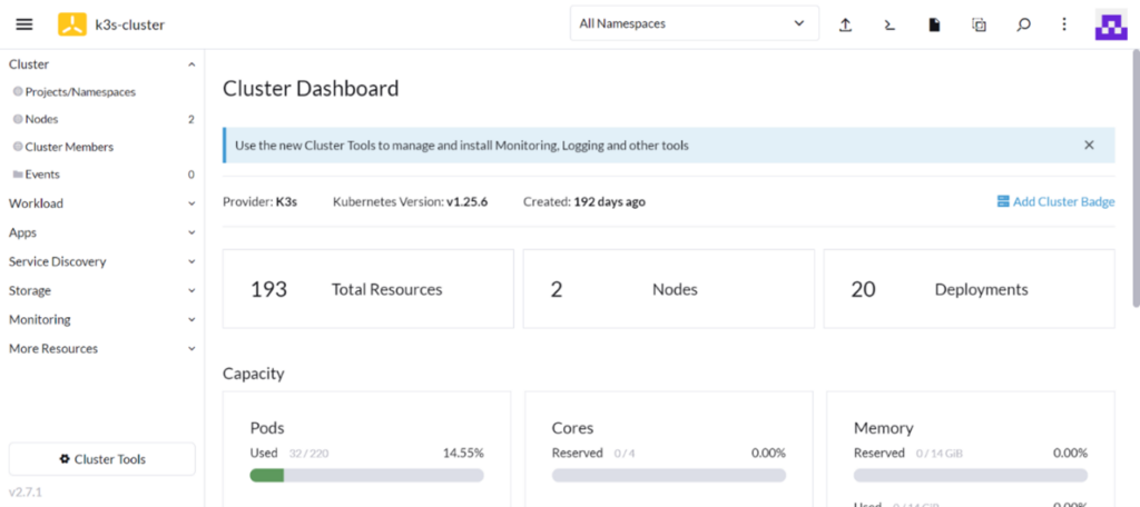 Rancherへログインすると以下のような画面で、各種Kubernetesリソースを操作できます。