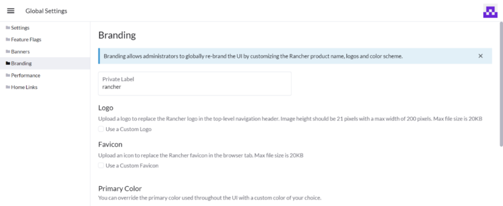 | Primary Color | Use a Custom Color | ■/□ | チェックボックスをオンにするとRancherのインターフェイスで使用されるメインカラーを変えられる |