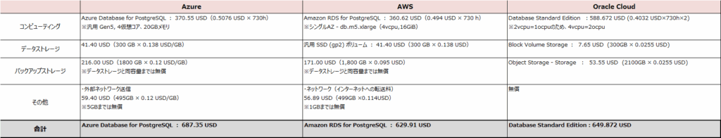 - コンピューティングはOracleCloudがOracleDatabaseしかPaaSとして選択できないため、Oracle Cloudと比較しAWSとAzureが同程度の費用感で安い