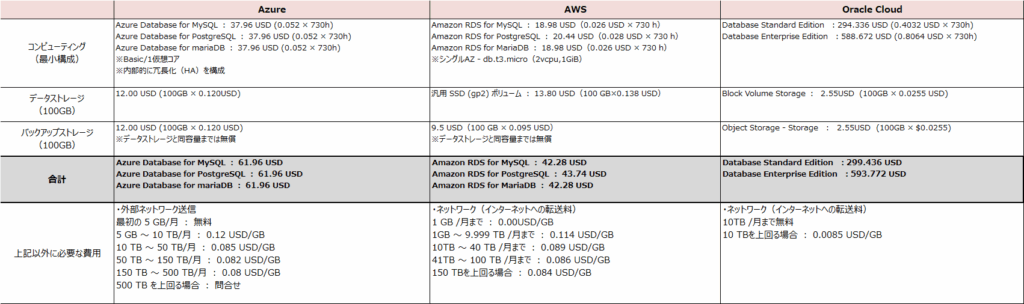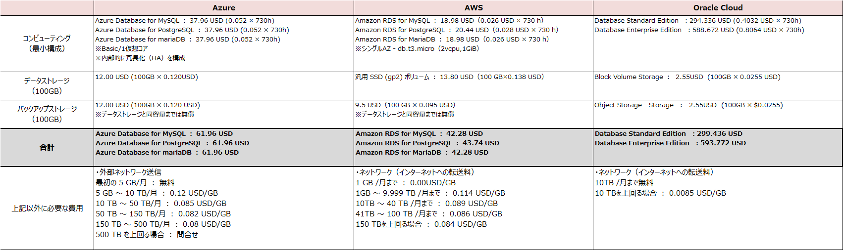- データベースを利用するために必要な利用料の合計は、上記の条件下で算出した場合には、3社とも大きな費用差は無い