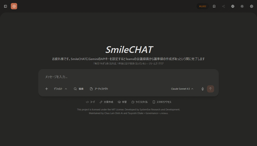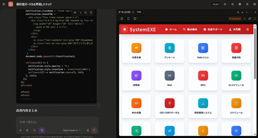 SmileCHATは、アーティファクトパネル経由でリアルタイムなコード検証やドキュメント生成を支援する中核ツールです。