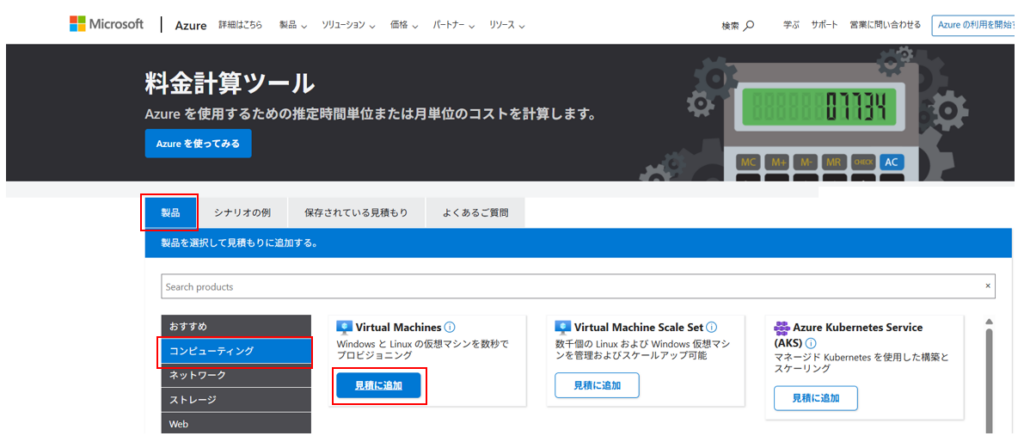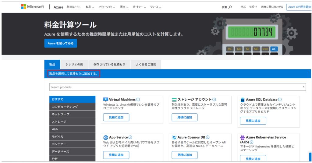Microsoft Azure料金計算ツールとは、Microsoft社が公開している特定のシナリオに合わせてAzureの製品と機能のコストの見積もりを作成するツールです。