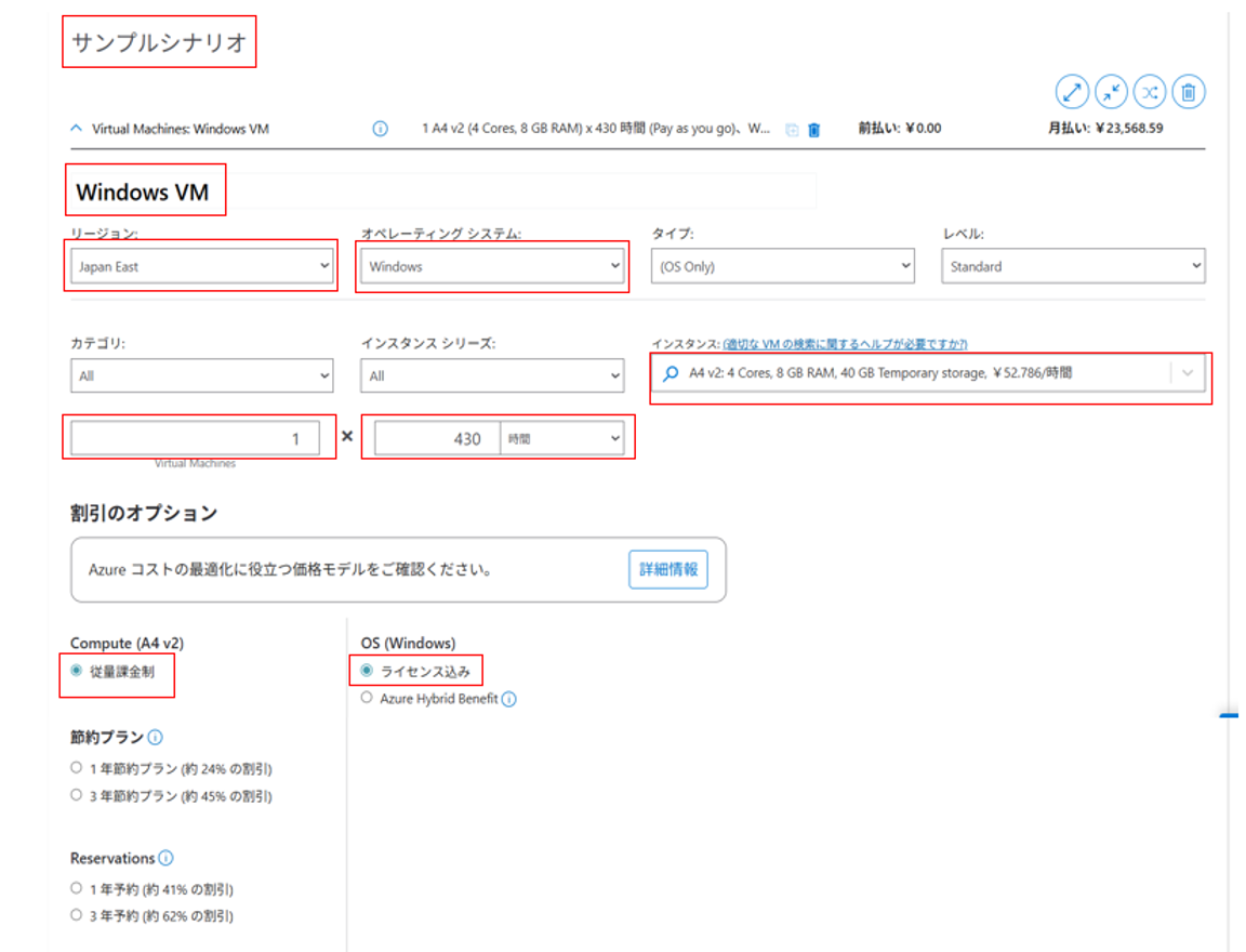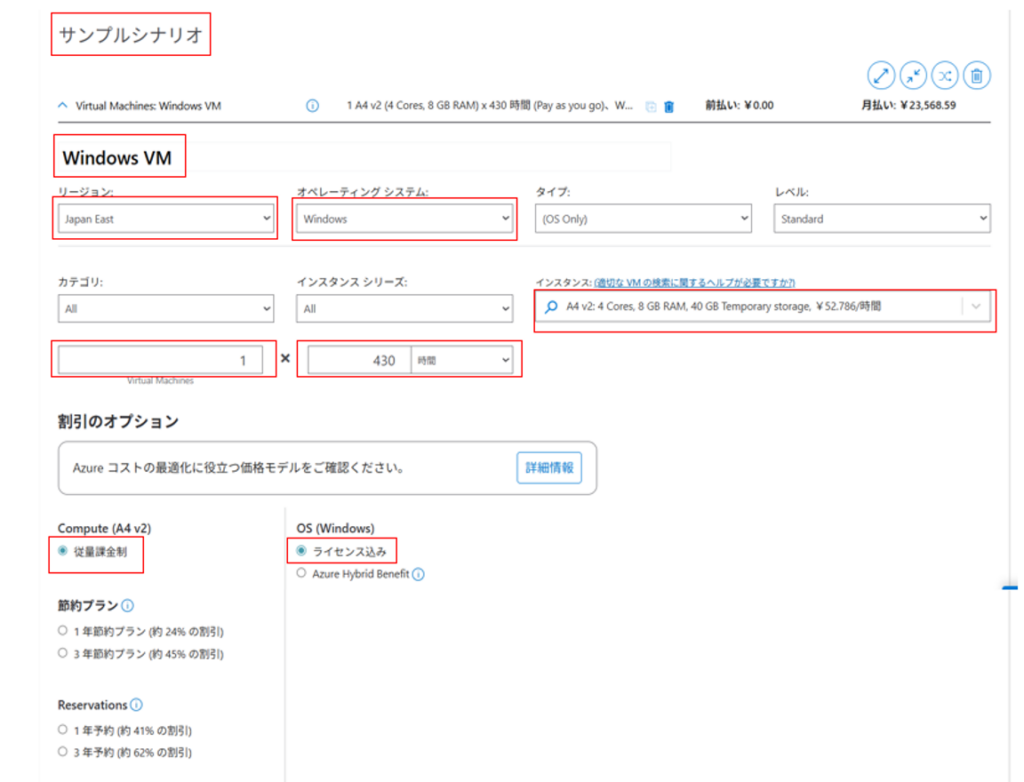 ③今回の見積もり名として「サンプルシナリオ」、サービス項目名に「Windows VM」と入力し、リージョンやOSなどを入力します。