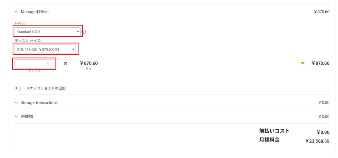 ストレージトランザクションと帯域幅については、今回の要件では定義していないため デフォルトのままとします。