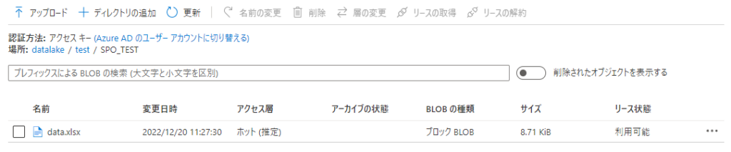 パイプラインをデバッグ実行して正常終了し、ストレージにファイルが連携されたことを確認できました(Excelファイルをそのまま連携した例)。