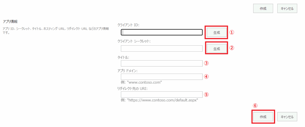 ①アプリID:手順1-2で生成した②の「クライアントID」を入力します。