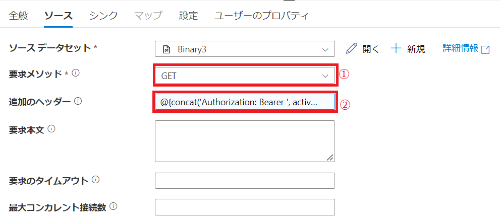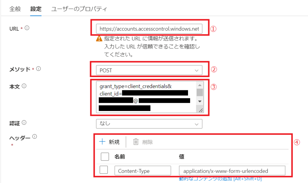 ②追加ヘッダー : @{concat(‘Authorization: Bearer ‘, activity(‘Web1’).output.access_token)}