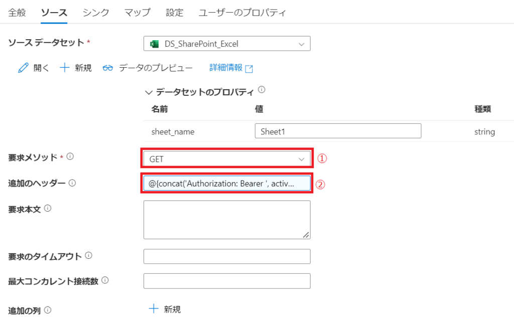 | シート名 | シート名を直接記載するか、パラメータ化する場合は「@dataset().sheet_name」のように設定 |