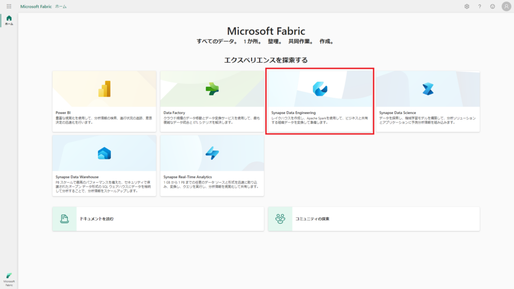 まずはホーム画面から「Synapse Data Engineering」を選択します。
