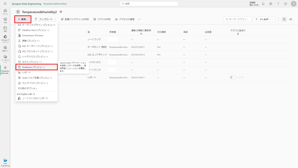 作成したワークスペースから「新規」→「Notebook(プレビュー)」をクリックします。