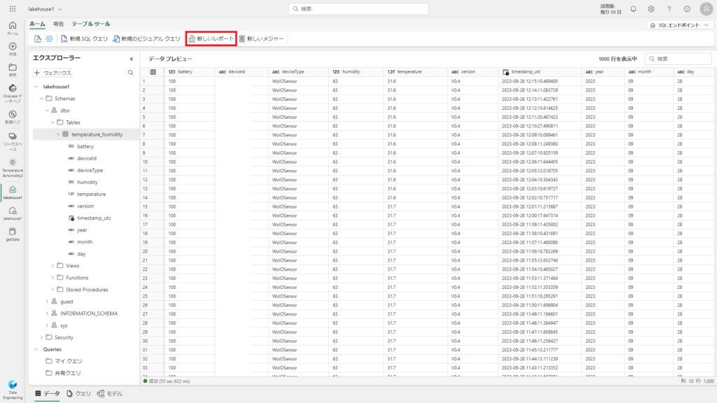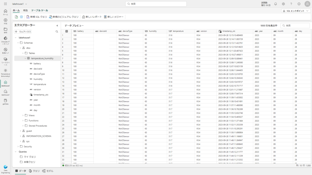 これを実行すると、左側のレイクハウスにテーブル「temperature_humidity」が自動作成されます。