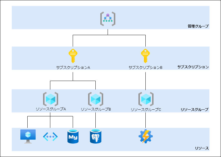 管理グループ、サブスクリプション、リソースグループ、リソースでは、それぞれの階層で権限・ポリシーの設定が可能です。