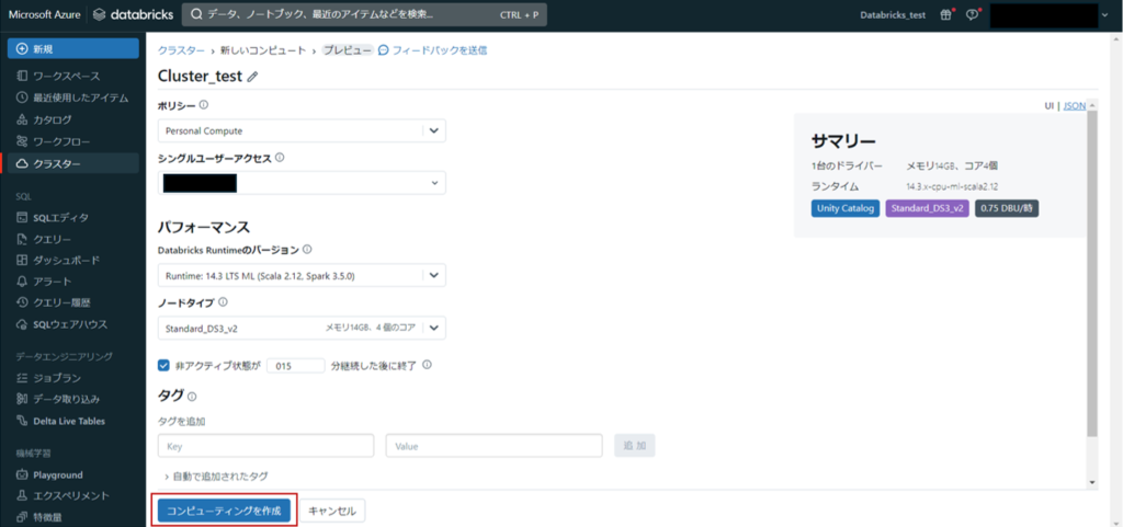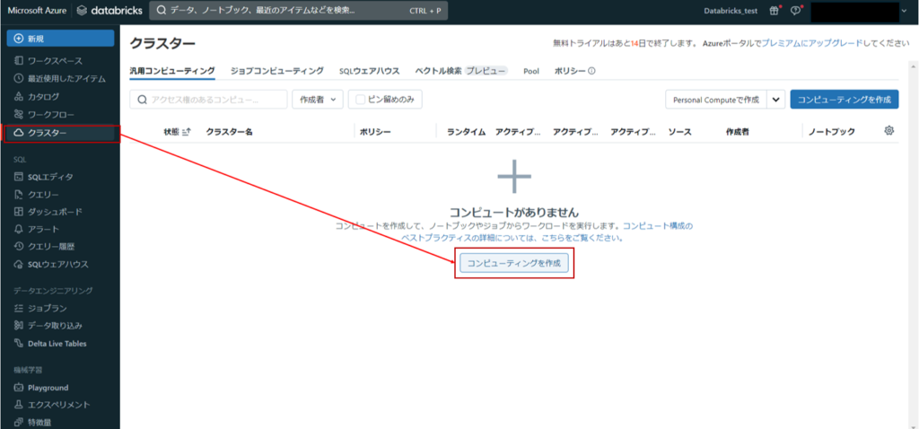 Azure Databricksのホーム画面から「クラスター」を選択し、「コンピューティングを作成」をクリックします。