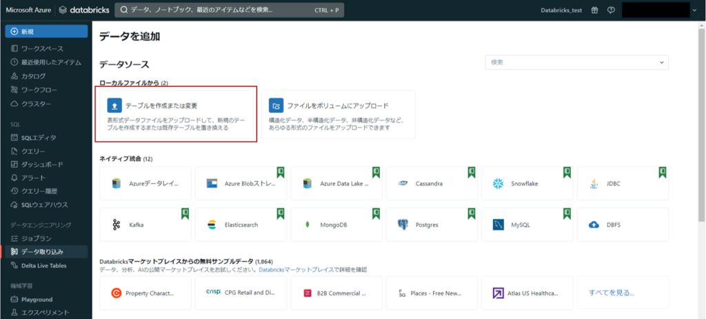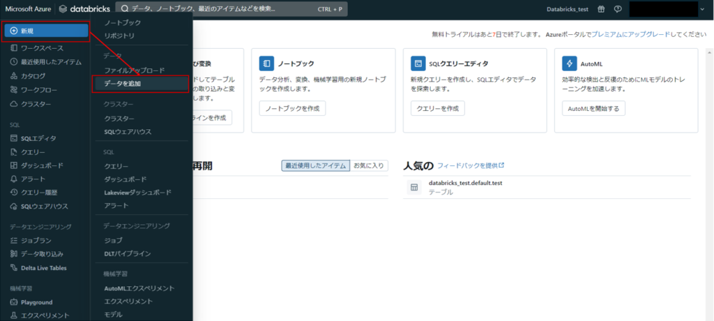Azure Databricksのホーム画面から「新規」→「データを追加」の順に選択します。
