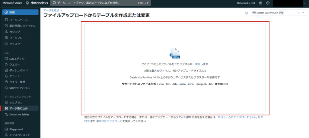 赤枠で囲んだ点線内にテーブル化したいファイルをドロップ、または点線内をクリックしファイルを参照します。