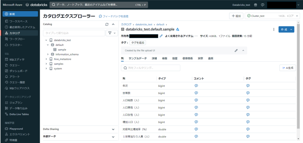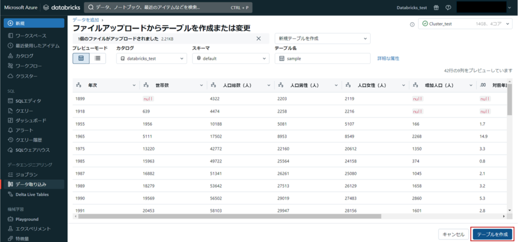 カタログとスキーマは選択ができ、選択したカタログとスキーマの配下にテーブルが作成されます。