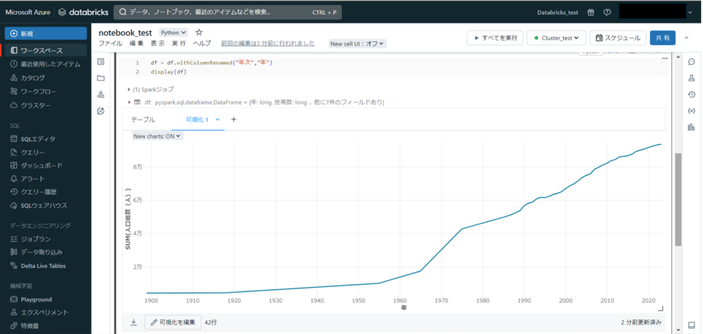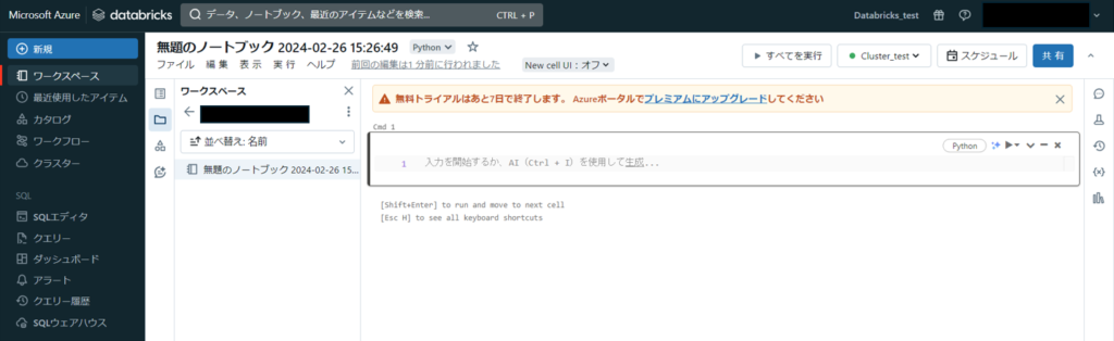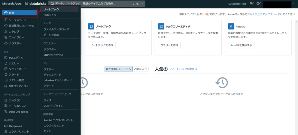 Azure Databricksのホーム画面から「新規」→「ノートブック」の順に選択します。